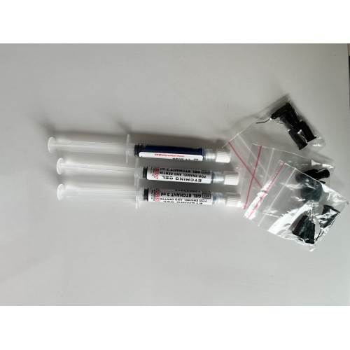 Ething Gel, %37 H3PO4 yarı jeli olan ve mine ve dentinin hızlı bir şekilde aşındırılmasında en etkili olan bir yüzey hazırlama maddesidir. President Dental ETCHING GEL, mine yüzeyinde mikro gözenekler oluşturur ve dentin tübüllerindeki tıkanıklığı açmak için smear tabakasını kaldırır. Yapışkan reçine penetrasyonunu ve reçine etiketi oluşumunu destekler. AŞINDIRMA JELİ restorasyonun mekanik tutuşu için hayati öneme sahiptir.