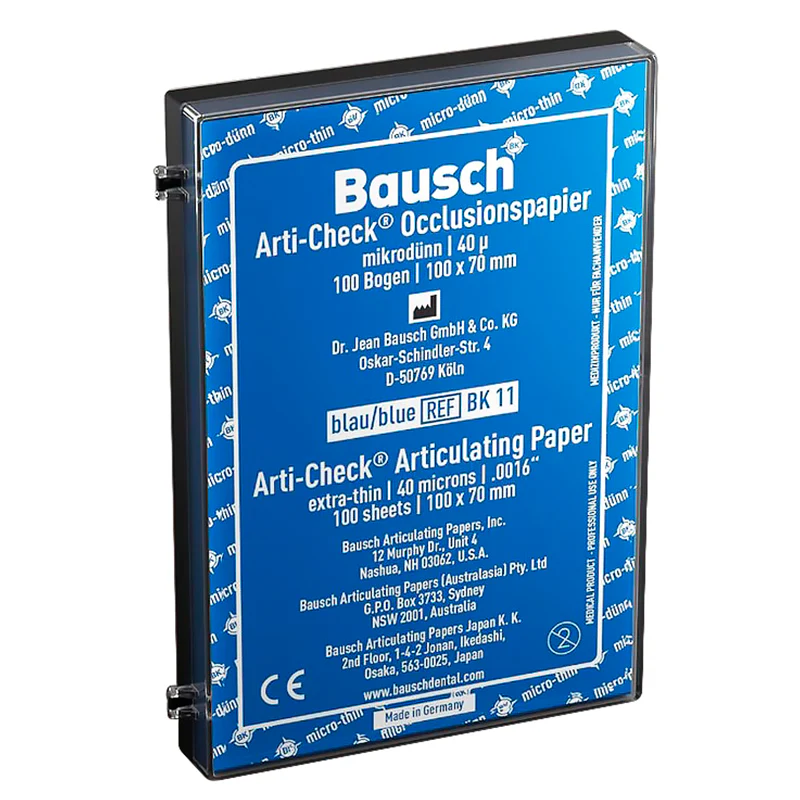 Bausch 40 mikron artikülasyon kağıdı, ince yapısı ile oklüzal temasların hassas değerlendirilmesi için kullanılır. Mavi pigmenti sayesinde temas noktalarını net ve kontrollü şekilde gösterir. Yaprak formu ile klinikte hızlı kullanım sağlar.