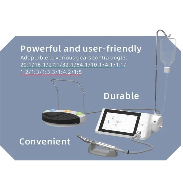 Dijital kontrol paneli üzerinden hız, tork ve irrigasyon ayarları kolayca yapılabilir. Önceden tanımlanabilir cerrahi modlar sayesinde farklı implant sistemleriyle uyumlu kullanım imkânı sağlar. Ergonomik el aleti ve sessiz çalışma özelliği, uzun süreli cerrahi işlemlerde hekim konforunu artırır.