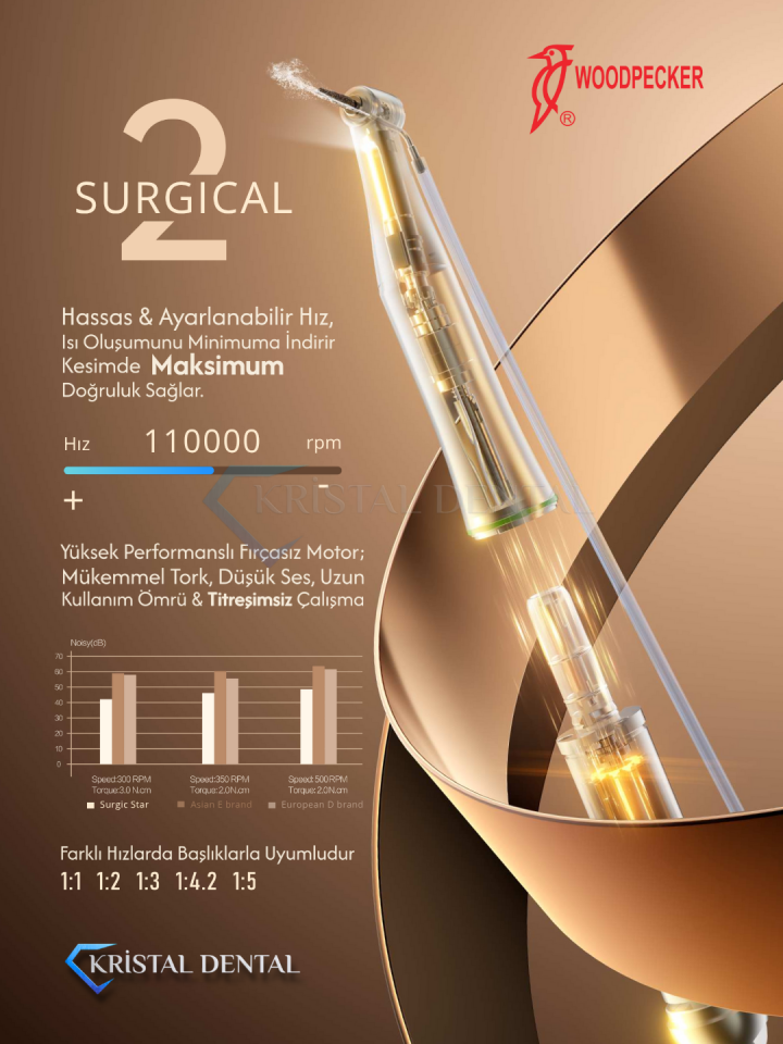 "Surgic Star, tek bir platformda yüksek güçlü motor teknolojisi, hassas kesim destek sistemi ve akıllı kontrol modlarını bir araya getiren, profesyonel kullanım için geliştirilmiş çok fonksiyonlu bir dental cihazdır. Farklı uygulama senaryolarına uyum sağlayan yapısı sayesinde kontrollü, dengeli ve stabil bir çalışma deneyimi sunar.